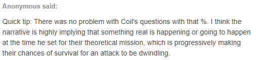 Here, Dinah doesn’t specify the state they come back in. She says there’s a 46.62354% chance they come back at all. Then Coil goes ahead to ask the probability that, with his help, they come back intact: