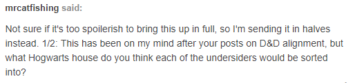 Taylor: Slytherin. No doubt. She’s resourceful, cunning and ambitious, even though her ambition to become a hero kind of fell by the wayside as of the Decision. If she had to be something else, Ravenclaw.