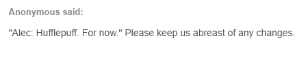Honestly, the main reason I put him in Hufflepuff was that I don’t feel like I know him well enough to put him anywhere else yet. He ended up in Hufflepuff because of Hufflepuff’s willingness to “take the rest”, not because of the core values of the house.