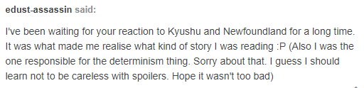 As for the determinism thing, don’t worry about it. It was never a major spoiler (I think), even before I got an ask arguing against it, and I got the sense that you weren’t expecting me to be able to read that in the first place. 🙂