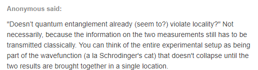 Anyway, I admit I’m not strong on quantum mechanics, and this is clearly something people much smarter than me have been discussing for decades, so they probably know what’s up, though it doesn’t make sense to me to (as the case seems to be based on the previous ask on this issue) assume that locality is a thing just because it’s convenient for our scientific methods that it is, especially if it stops us from looking into more solid causes for quantum behavior.