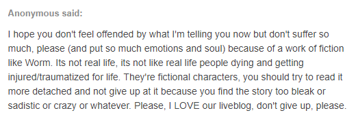 Oh, I’m already fairly detached. It’s my default state, really, and for all its good points, Worm is not actually all that good at making me empathize with the characters (except Taylor, who has a distinct advantage by being the main POV character).