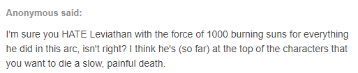 But yeah, Leviathan honestly feels more like a wild animal or a force of nature than a character, so even though he has by far the largest killcount out of any character in the story so far other than possibly the other two Endbringers, I have a hard time truly holding him fully accountable.