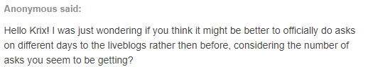 That said, that will lead to a reduction of liveblog frequency. I still need my off-days, and asks are becoming less of a thing that I can do on those off-days, so we’re looking at going from “liveblog every two days most of the time” to “liveblog every three days most of the time, with an ask day on the second day”.