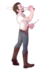 First off we have the man who can wield a bearing-sword-sized, or bigger, blade as effortlessly as a dagger, provided it started out as one. I like the use of different blade sizes in the piece to illustrate his power. (Update: This piece is by synapsekisses)