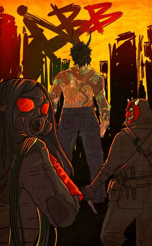 I glanced at his picture [on Parahumans Online]. His costume consisted of a black bodysuit with a black bandoleer and belt for his knives, guns and grenades. The only color on him was an ornate Japanese-style demon mask, crimson with two green stripes down either side. Except for the mask, his costume gave off the distinct impression of a ninja, which just added weight to the notion that this was a guy who could and would slide a knife between your ribs.