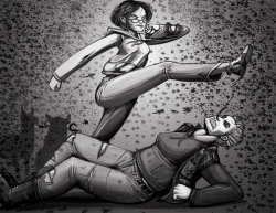 Drunkfu’s grayscale is very fitting for the story as a whole, and their poses are very dynamic. You can really feel that Taylor is moving in both of the pieces featuring her, and even with Grue’s standing pose, it feels to me like he just stopped moving and took off his helmet. Also, damn it must’ve taken a while to draw all those insects in the Taylor vs. Rachel drawing.