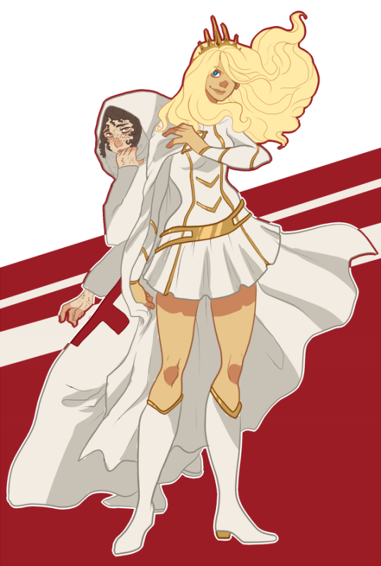 In Aerryi’s art of Victoria/Glory Girl and Amy/Panacea, I love the simplicity of the background and the color palette. The soft red and white, with outlines of the other color, dominate the image and make it rather pleasing to the eye, while the girls’ skin, hair, etc. provide splashes of other colors that help them stand out. I really like how the whites of their respective outfits match, too, and sort of blends the two of them together. They share a connection, and you can see that.