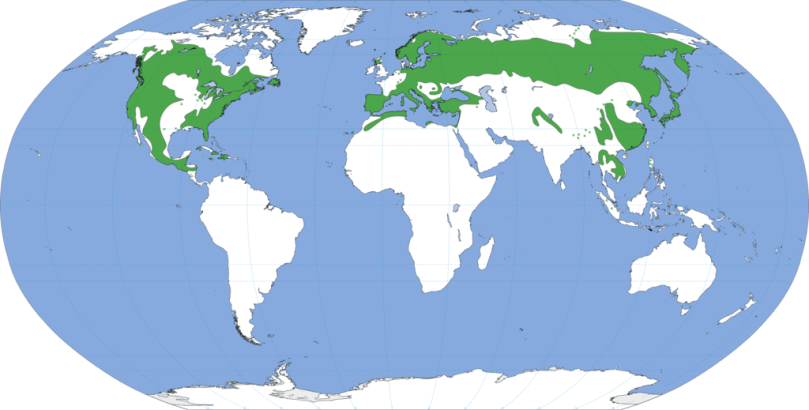 Most regions of the Northern Hemisphere (see List of pines by region) host some native species of pines. One species (Sumatran pine) crosses the equator in Sumatra to 2°S. In North America, various species occur in regions at latitudes from as far north as 66°N to as far south as 12°N.