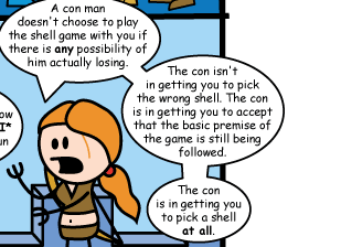 Haley: The con isn’t in getting you to pick the wrong shell. The con is in getting you to accept that the basic premise of the game is still being followed.