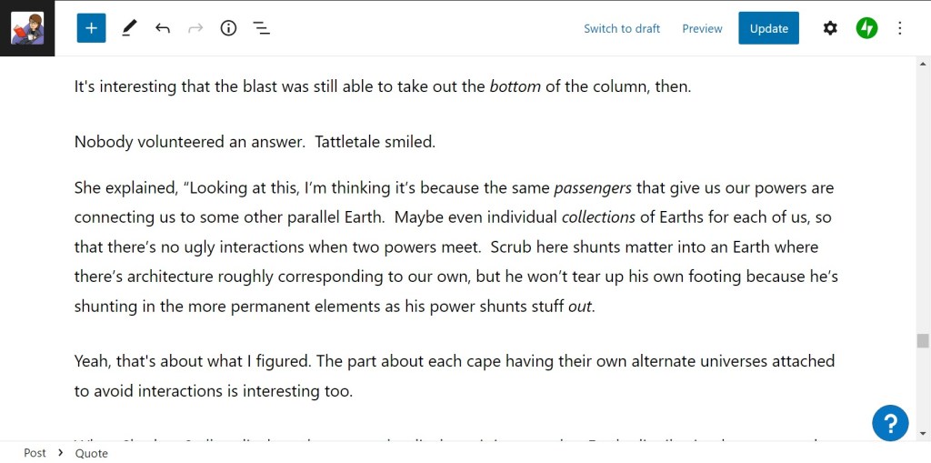 Making it more annoying is the fact that if I make it a quote block first, and then paste something with a paragraph break in it, the quote block just turns back into a pair of paragraph blocks. (If there’s only one paragraph, this tactic works fine and I get a proper quote block.) This means that whenever I quote multiple paragraphs, I have to highlight both/all paragraphs after pasting in order to turn them into quote blocks. Sometimes I miss the first paragraph or forget it was multiple paragraphs to begin with, and that’s how we end up with these bits of quote left out in the open.
